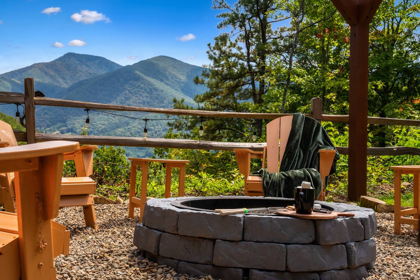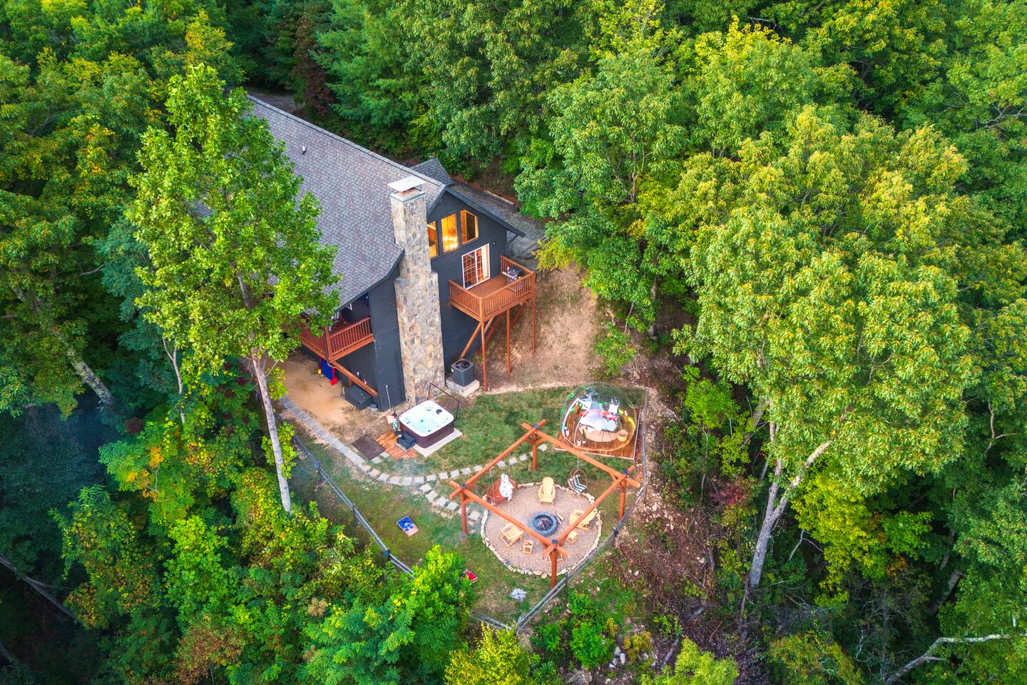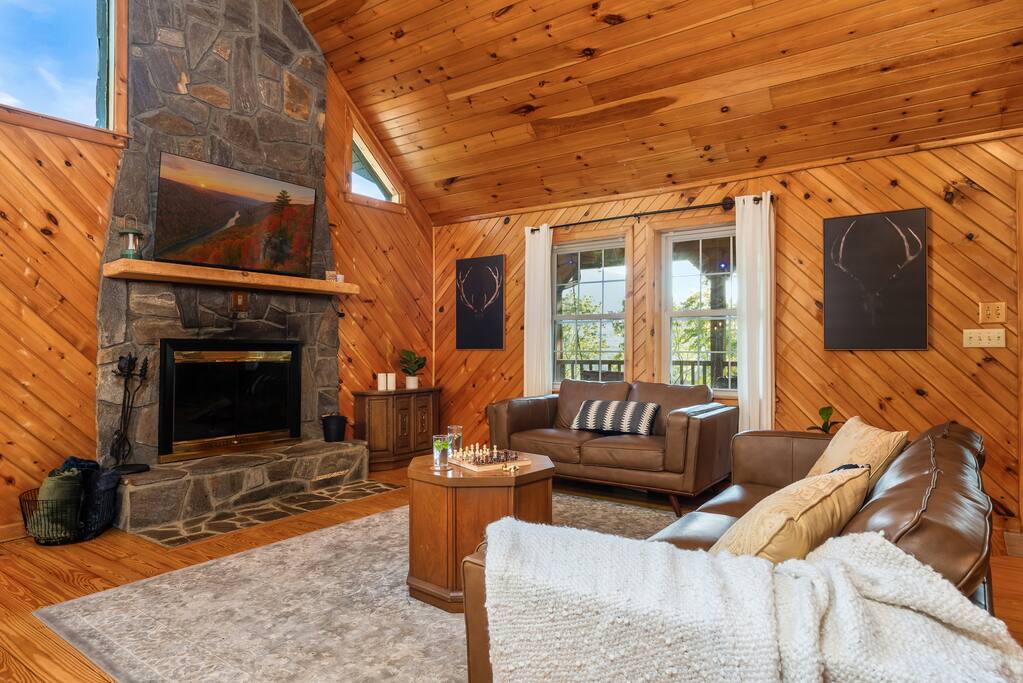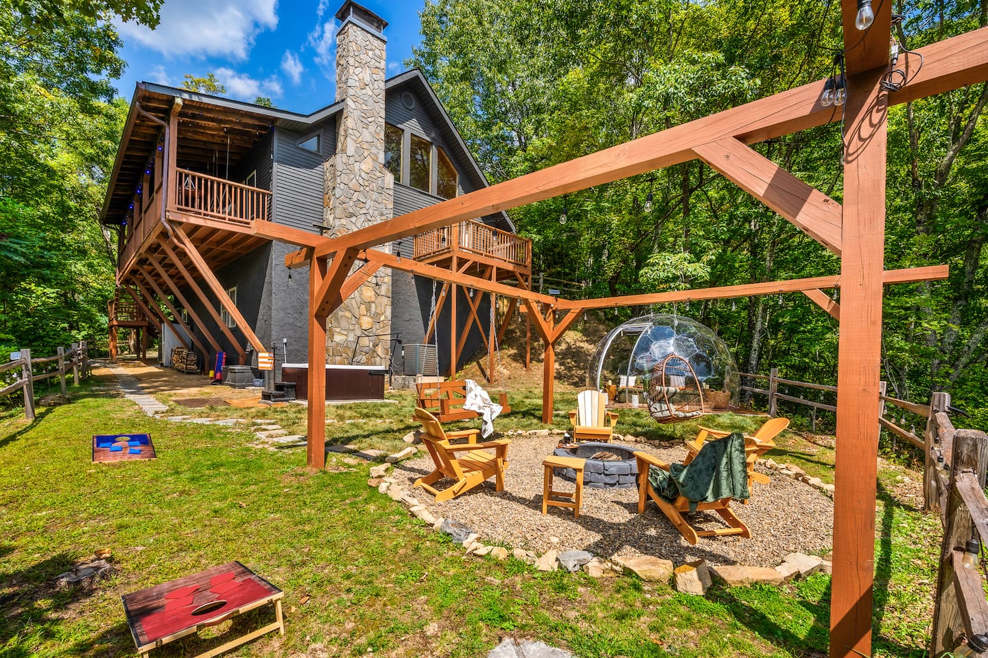 The Space: KEY FEATURES: ☀ Long Range Mountain and Valley Views ☀ Private Hot-tub open 24 hours, can accommodate 7 persons ☀ Private Fire Pit with swing set, lounge chairs & hammocks — perfect for stargazing ☀ Geodome with cozy ambiance for stargazing and relaxation ☀ Pet Friendly (Pet Fee and Dog size restrictions apply) ☀ Game Room (Arcade games, Pool Table, Foosball, Poker Table) ☀ Fun Wall Climbing Adventure for Kids Ages up to 12! ☀ Private Theater Room ☀ 4 bedrooms: 1 King Bed, 2 Queen Beds, 2 Twin Bunk Beds ☀ 3 bathrooms spread out over two levels ☀ Beautiful fully equipped kitchen with brand new appliances ☀ Cozy living room with stone fireplace ☀ Balcony with sweeping views ☀ High-speed Internet ☀ AC/Heat ☀ Washer and Dryer ☀ Filtered water throughout the home (Safe to consume) This 4-bed/3-bath Cabin has an open interior design with many spots to hangout with friends or family and to soak in nature. You can cozy up in front of the indoor Fireplace or outdoor Firepit, engage in competitive games in the Game room. OUTSIDE The yard has a stunning Fire Place area adorned with swing sets and string lights to relax and to make smores with friends and family and enjoy Smoky Mountains View. Dining for 8 at the table and a breakfast bar that seats 3. Living room has loads of natural light and 55 inch TV to enjoy with family. Porch filled with rockers and swing for relaxing and looking at the view. Master bedroom has king bed with closet, dresser and additional TV. The 2 bedrooms have queen beds with closet and dresser. 2 Twin bunk beds help comfortable stay for kids and large groups. This impressive cabin offers modern amenities such as a washer and dryer, high-speed WiFi, laptop-friendly workstation, full size kitchen and bathroom essentials. There is reliable high-speed internet throughout the entire property with flat-screen Roku TVs. From here, you’re just a short drive from local grocery stores, retail shops, and some of Maggie Valley's most popular attractions. Designed with traveling families in mind, this five-star adventure cabin is the best way to experience the Great Smoky Mountains in western NC. This is a pet-friendly home and your pets can now be included at the time of reservation via AirBnb! A one time $115 pet fee will be applied to the total of your stay. Please inquire with the owner for approval prior to booking your reservation. Fees must be paid in full prior to receiving the access codes for check-in. Dog(s) must be house and crate trained. Failure to get pet approval prior to your stay will result in a fine in addition to standard pet fee.