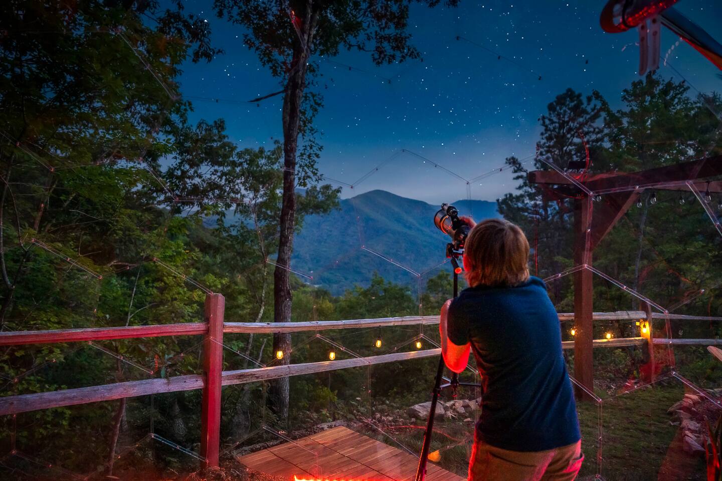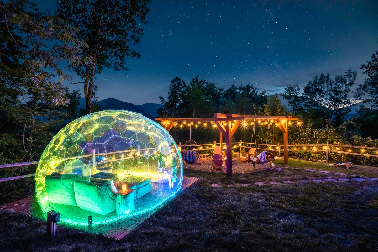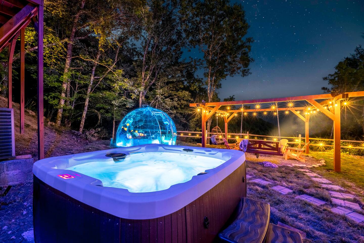Escape to the mountains with breathtaking views, relax in the hot tub or by the firepit, stargaze in the geodome, and enjoy endless fun in the game and theater rooms.