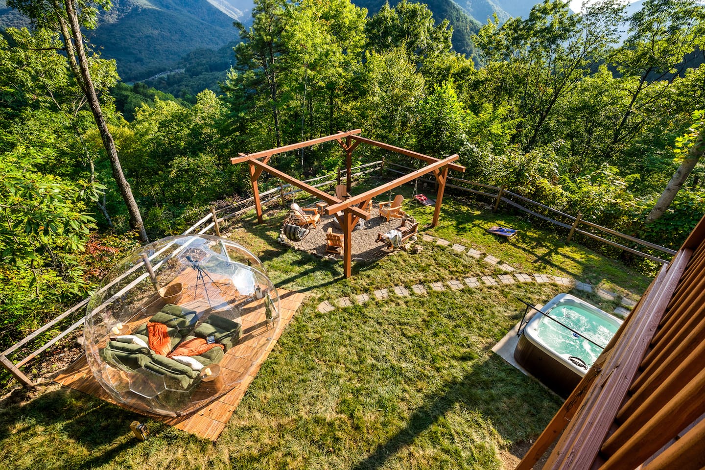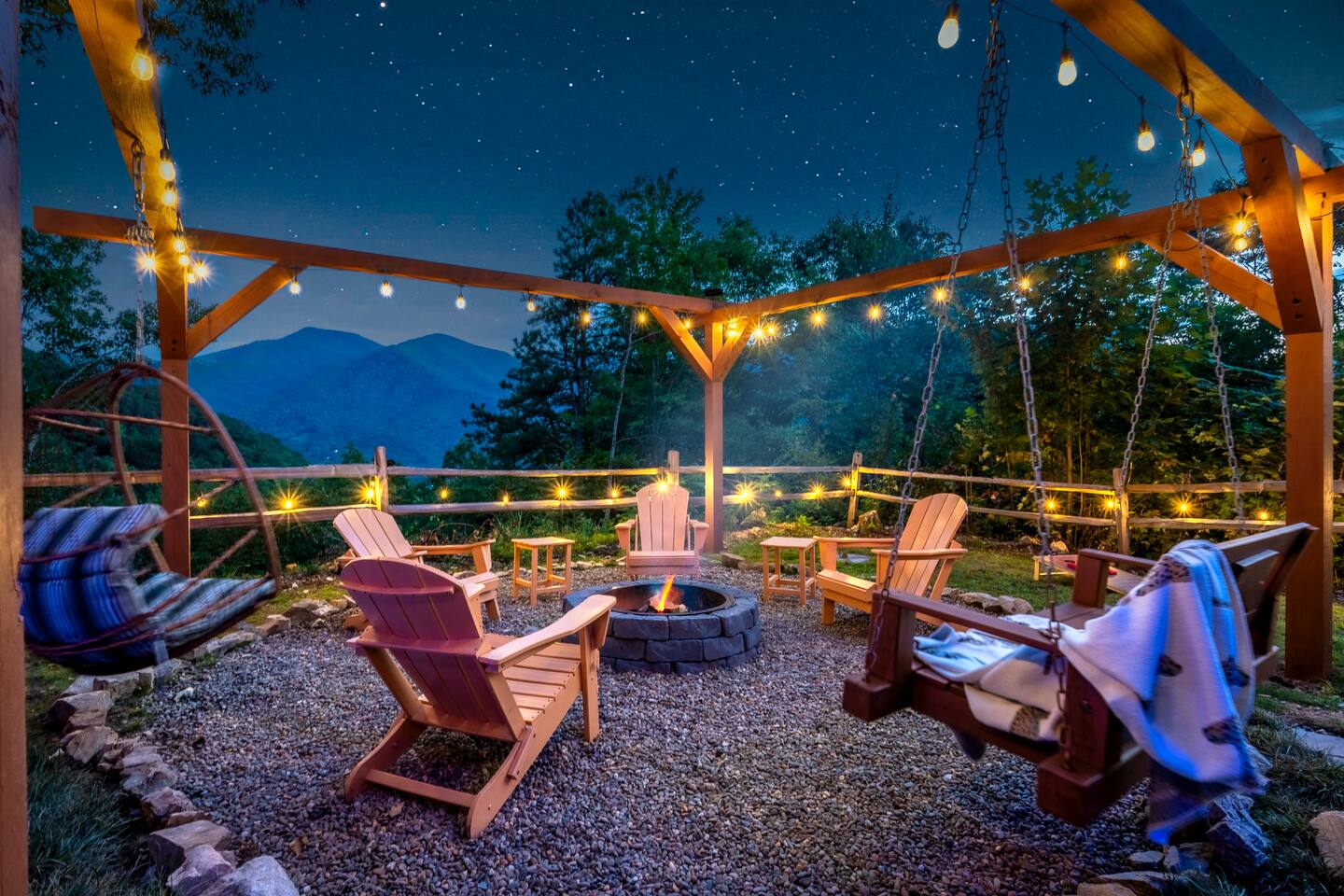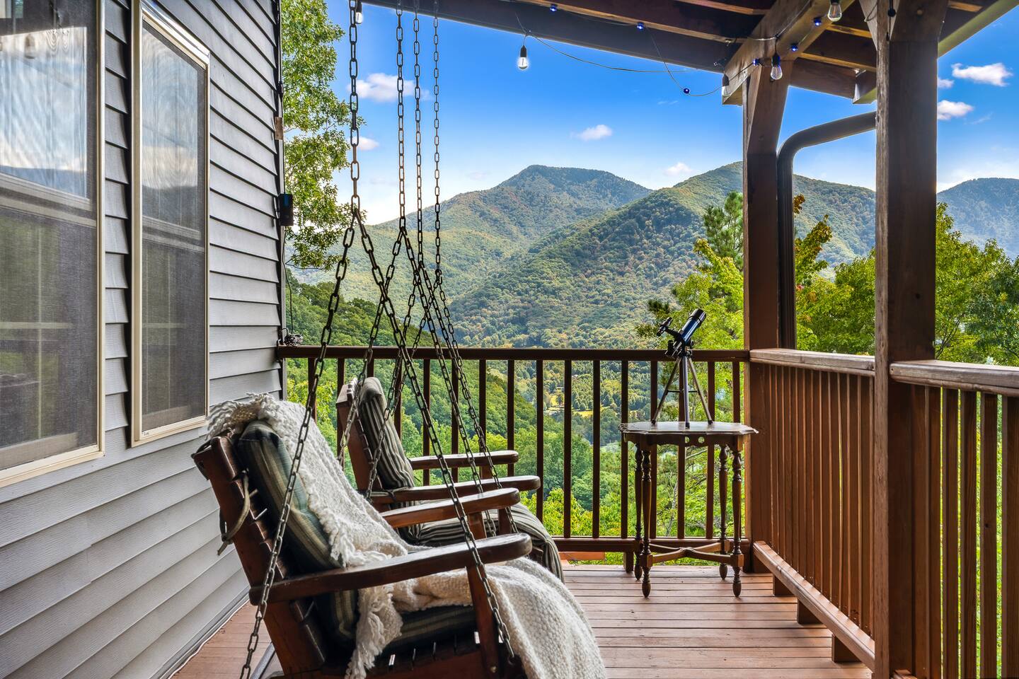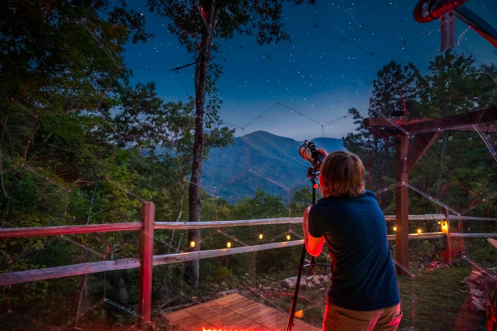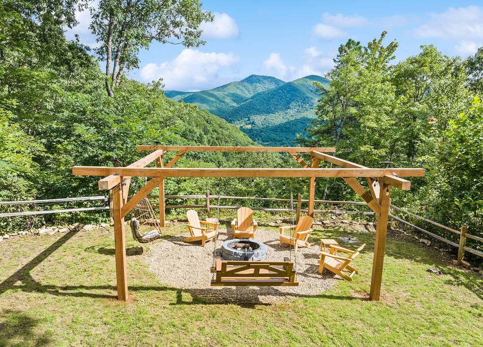 The Infinite Haven is a pet friendly rustic mountain retreat with breathtaking long range mountain and valley views, a star gazing geodome, a beautiful hot-tub fireplace with swing set - perfect for relaxing and snapping your next insta worthy photos while star gazing! With a fully stocked kitchen, game room (pool table, poker table, arcade games), theater, huge private backyard, there’s something for entire group. -4 min to Maggie Valley Downtown -Mins away from hikes and waterfalls