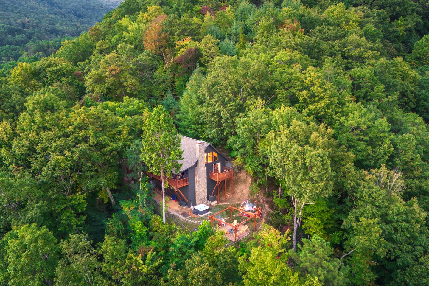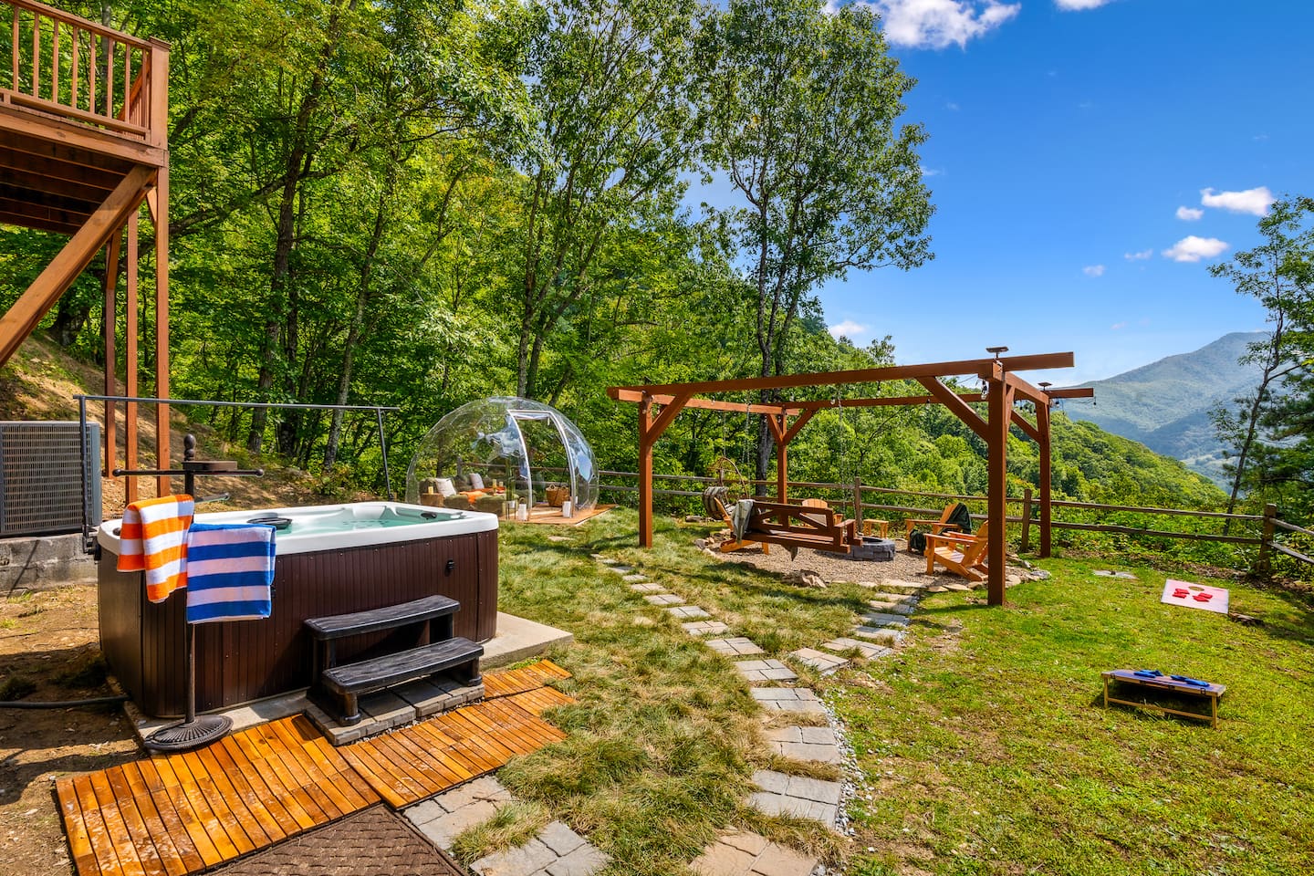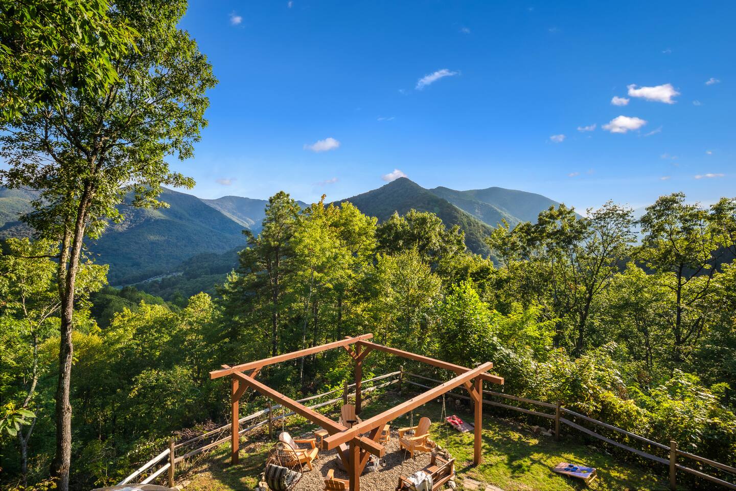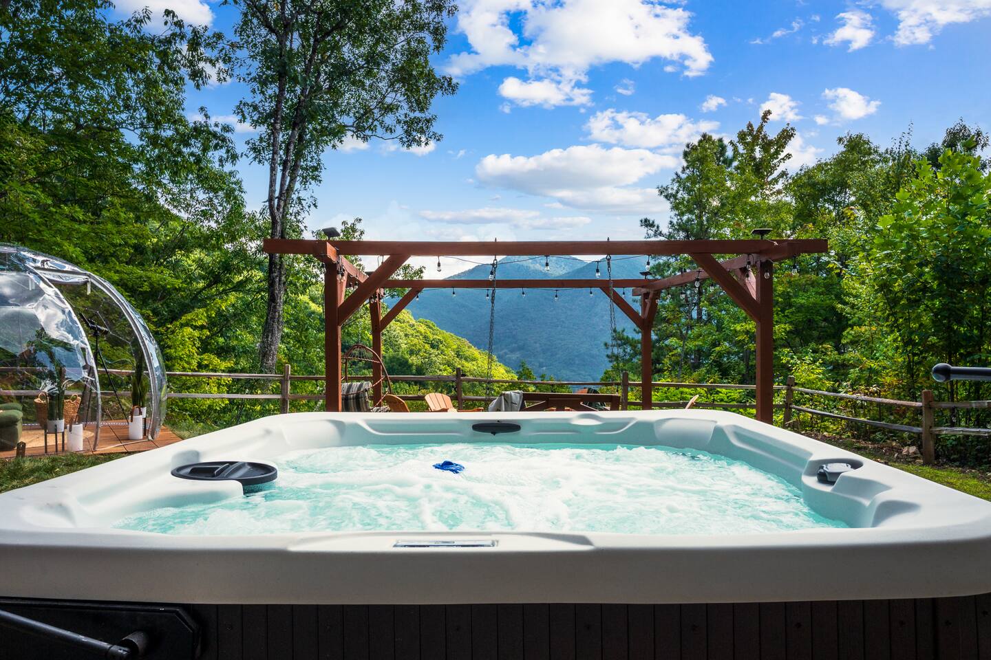 The Infinite Haven is a pet friendly rustic mountain retreat with breathtaking long range mountain and valley views, a star gazing geodome, a beautiful hot-tub fireplace with swing set - perfect for relaxing and snapping your next insta worthy photos while star gazing! With a fully stocked kitchen, game room (pool table, poker table, arcade games), theater, huge private backyard, there’s something for entire group. -4 min to Maggie Valley Downtown -Mins away from hikes and waterfalls